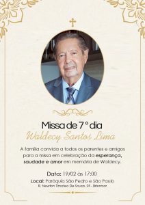 A missa de sétimo dia de Waldecy Santos Lima será realizada nesta segunda-feira (19), em João Pessoa. A cerimônia religiosa está marcada para as 17h, na Paróquia São Pedro e São Paulo, no bairro Brisamar.