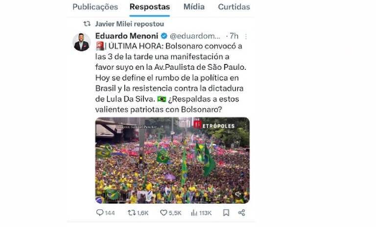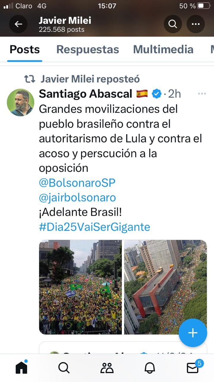 Milei também retuitou mensagens de Santiago Abascal, líder da extrema-direita espanhola, sobre o suposto autoritarismo que estaria vigente no Brasil. Veja abaixo:
