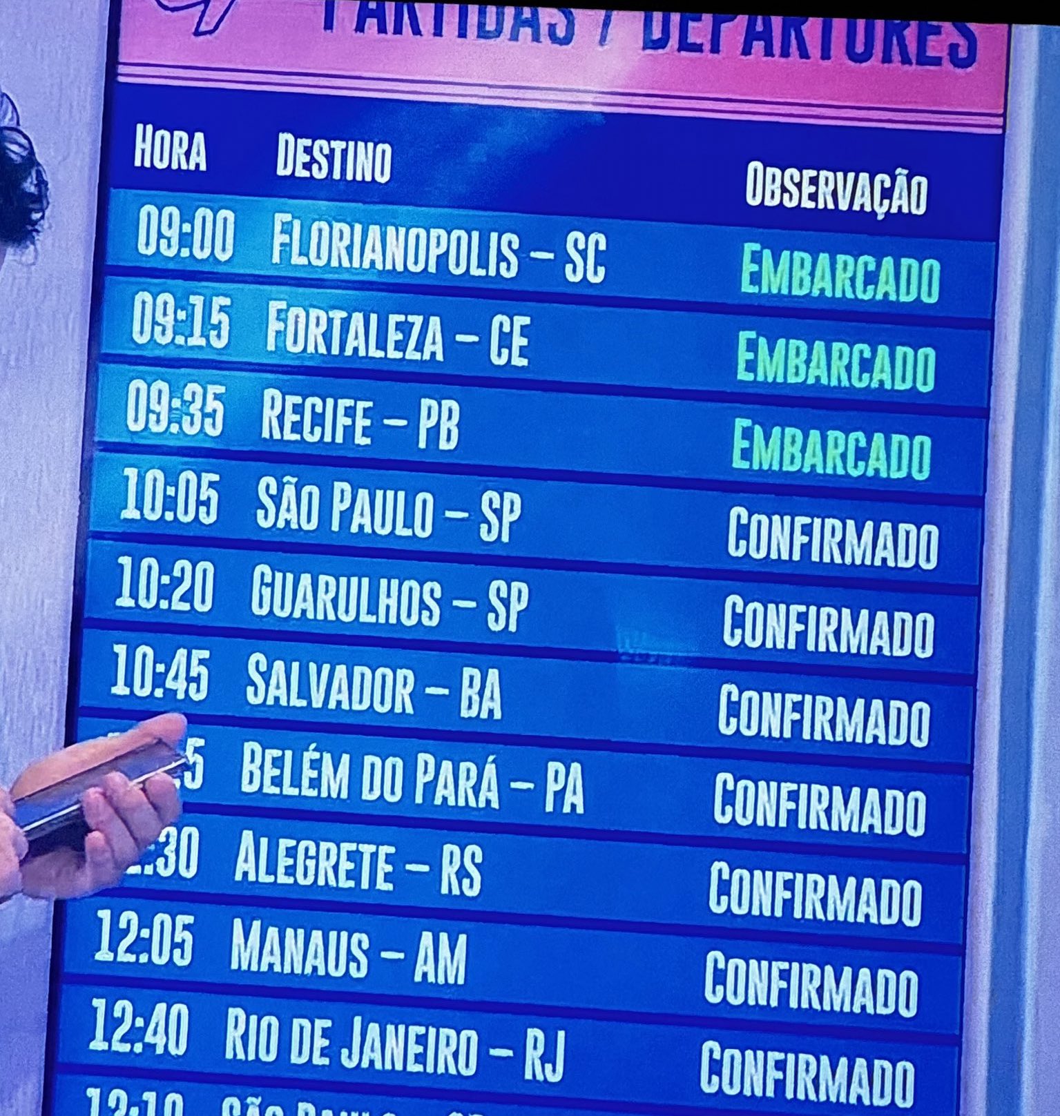 A patrocinadora simulou um ambiente de aeroporto, com uma lista de cidades brasileiras como voos prestes a partir. A sigla correta para Recife seria PE, de Pernambuco.