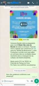 O deputado estadual Tovar Correia Lima (PSDB) afirmou na manhã desta terça-feira (26) que não esteve presente na cerimônia de lançamento do São João de Campina Grande 2024 que aconteceu na noite da última segunda-feira (25) por não ter sido convidado para o evento. O parlamentar afirmou que ao não ter recebido nenhum convite para estar no evento se sentiu constrangido de buscar o prefeito Bruno Cunha Lima (União) ou algum dos membros da empresa organizadora do evento para garantir um convite.