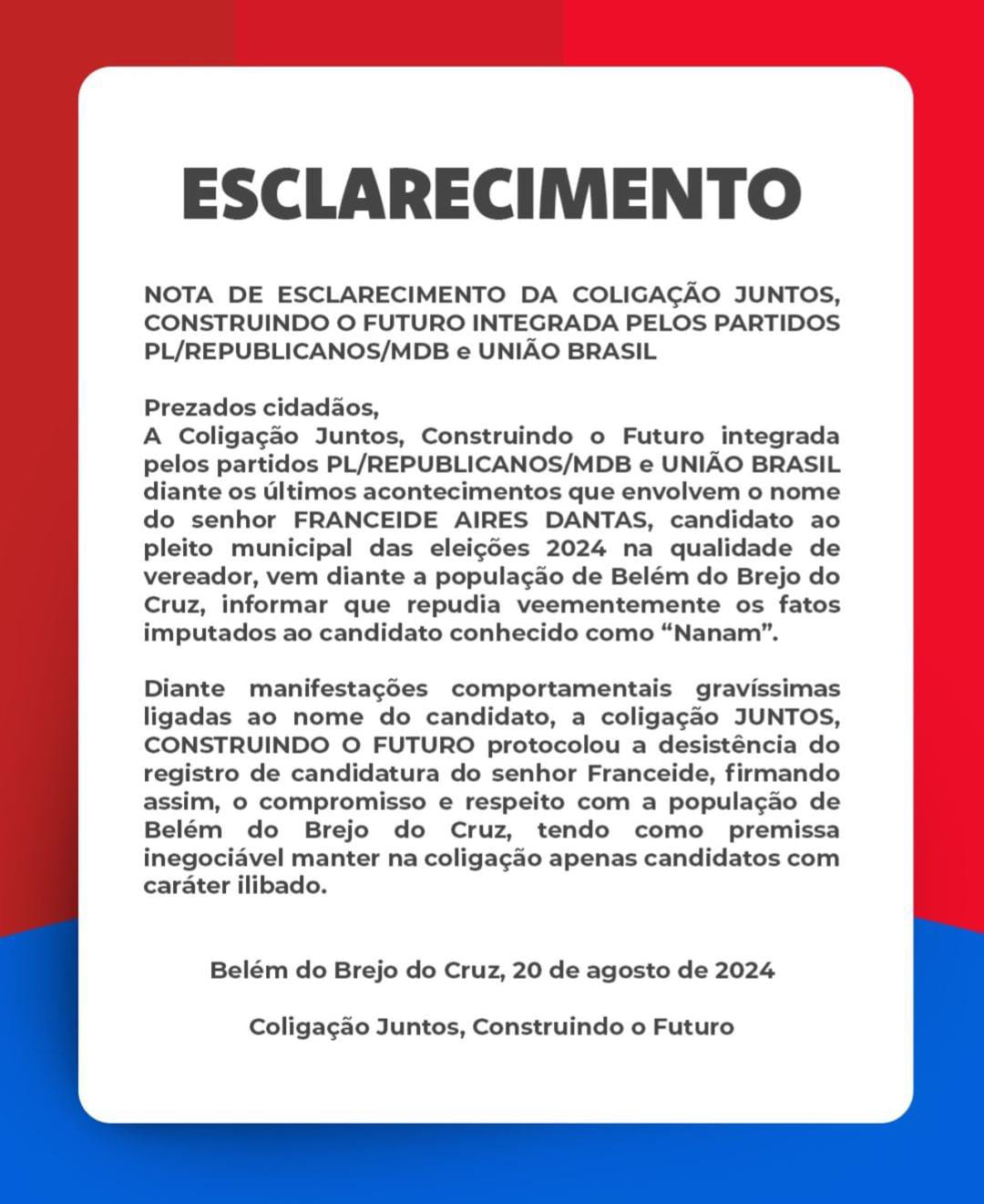 Em nota, a coligação afirmou repudiar veementemente os fatos imputados ao candidato e ressaltou que o compromisso da aliança é manter apenas candidatos com conduta ilibada. “Diante das manifestações comportamentais gravíssimas ligadas ao nome do candidato, protocolamos a desistência do registro de candidatura de Franceide Alves Dantas, em respeito à população de Belém do Brejo do Cruz”, declarou a coligação.
