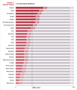 Embora alguns avanços tenham sido registrados, somente uma capital, Natal (52%), e três estados — Alagoas (54%), Ceará (47%) e Pernambuco (44%) — atingiram a paridade de gênero no período analisado. Em contrapartida, 20 estados e 16 capitais não alcançaram 30% de participação feminina em seus secretariados. Nos demais estados do Nordeste, Paraíba possui 20% de secretárias, Maranhão 21%, Bahia 31%, Piauí 25%, Rio Grande do Norte 40% e Sergipe 41%. Entre as capitais, as taxas variam: João Pessoa registra 21%, Salvador 38%, Fortaleza 20%, São Luís 30%, Maceió 12%, Recife 33%, Teresina 6% e Aracaju 13%.