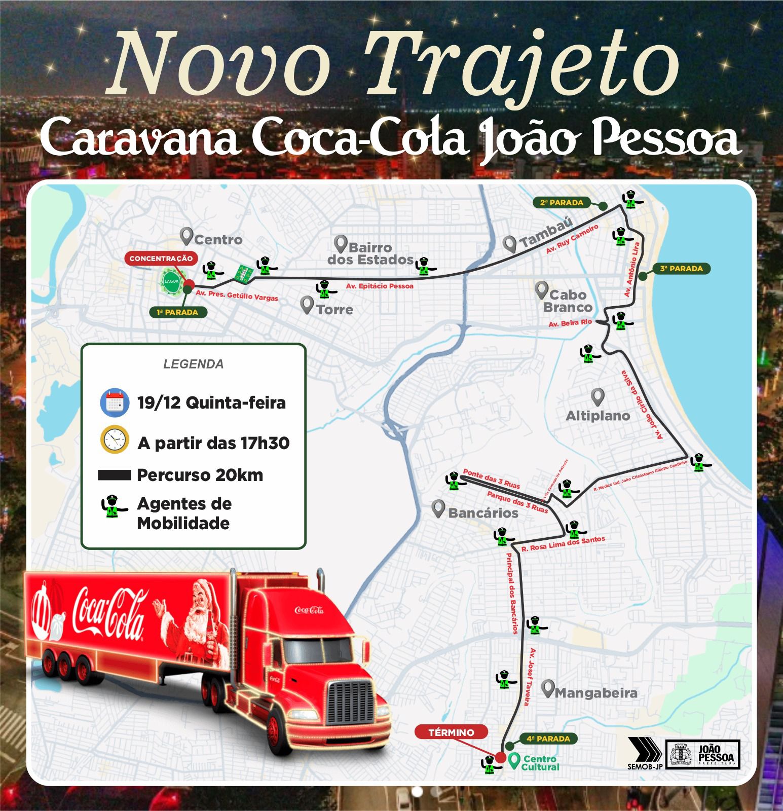 A Caravana de Natal da Coca-Cola passa por João Pessoa nesta quinta-feira (19) com rota modificada. A edição deste ano incluiu o Parque das Três Ruas, no bairro dos Bancários, em seu trajeto. A informação foi confirmada pela prefeitura da capital. A presença do Papai Noel integra o cortejo, que conta com quatro caminhões iluminados.