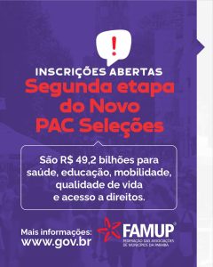 A Federação das Associações de Municípios da Paraíba (Famup) lembra aos prefeitos e prefeitas que já podem ser enviadas as inscrições de projetos para a segunda etapa do Novo PAC Seleções, programa do Governo Federal que visa melhorar a infraestrutura e a qualidade de vida das cidades brasileiras. O principal objetivo do programa é ampliar os serviços públicos, modernizar as estruturas urbanas e garantir mais mobilidade, moradia e qualidade de vida para os brasileiros.