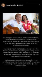 Em sua conta no Instagram, João Azevêdo compartilhou uma foto de Antônio Barros ao lado de sua esposa, Cecéu, também grande nome da música. Na legenda, o governador lamentou a perda, descrevendo Barros como um “expoente da música nordestina e um dos maiores compositores”. Ele ressaltou que, ao lado de Cecéu, Antônio Barros “eternizou clássicos que marcaram gerações e exaltaram nossa cultura com orgulho e autenticidade”.