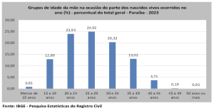 Em contrapartida, seguindo em trajetória crescente, como observado nas últimas décadas, aumentou a participação das mães que, por ocasião do parto, tinham 30 anos ou mais de idade, cuja proporção subiu de 36,7%, em 2022, para 37,3%, em 2023. De 2003 para 2013, essa proporção passou de 21% para 28,5%. O indicador paraibano de 2023 foi superior à média regional (36%), mas inferior à nacional (39%).