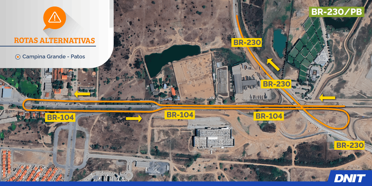 Os motoristas que seguirem no sentido Campina Grande, pela Avenida Assis Chateaubriand, em direção a Patos, devem redobrar a atenção. Com a interdição da alça de acesso do Cemitério Campo Santo Parque da Paz, o desvio deverá ser feito pela BR-104/PB até o retorno localizado no Condomínio Aluísio Campos. Em seguida, os condutores devem acessar a alça de subida do viaduto para retomar o percurso pela BR-230 no sentido Sertão.