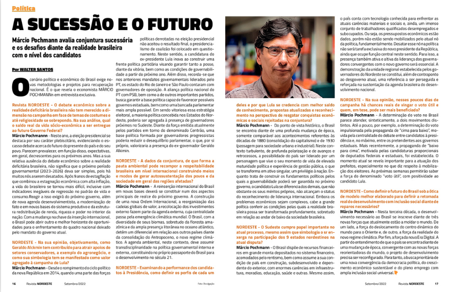 A Revista NORDESTE publicou em sua última edição, entrevista com o economista Marcio Pochmann, que comenta sobre o processo de sucessão presidencial em disputa nas eleições atuais.