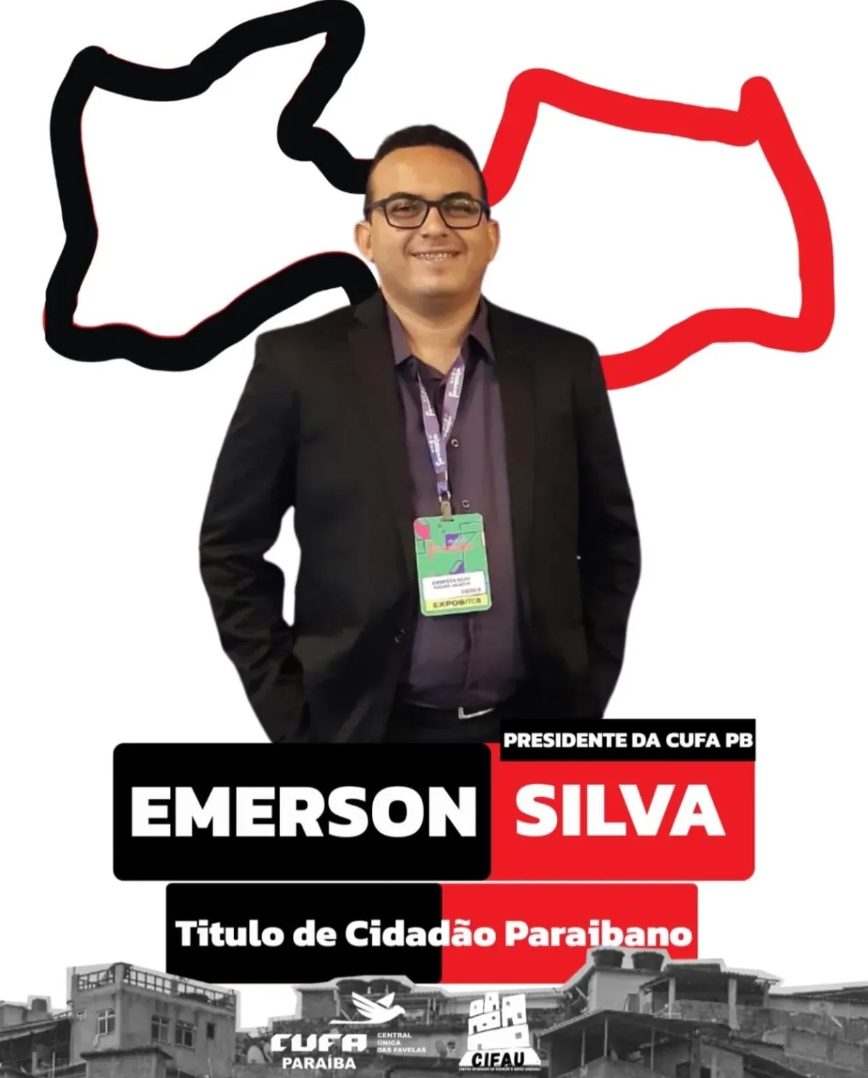 A Assembleia Legislativa da Paraíba (ALPB) realizará, no dia 23 de outubro, às 9h, uma sessão solene para a entrega do Título de Cidadão Paraibano a Emerson Silva, presidente da Central Única das Favelas na Paraíba (CUFA-PB) e coordenador geral da Taça das Favelas no estado, sendo um dos principais nomes do ativismo social paraibano.
