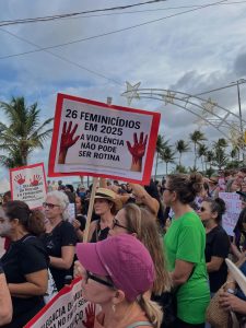 Mulheres, homens e famílias participaram da mobilização levando cartazes, faixas e entoando palavras de ordem para exigir ações mais efetivas de combate à violência contra a mulher. A manifestação integra uma série de atos realizados em várias capitais e cidades do interior em resposta ao cenário nacional alarmante: o Brasil já registra mais de mil feminicídios apenas em 2025.