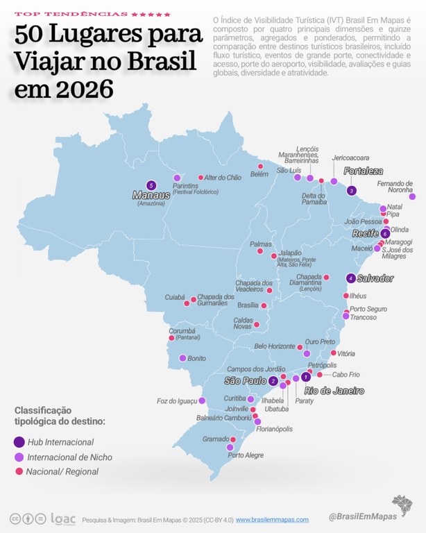 A Paraíba consolidou sua posição estratégica no cenário nacional ao ser incluída oficialmente na lista dos “50 Lugares para Viajar no Brasil em 2026”. O reconhecimento é fruto do Índice de Visibilidade Turística (IVT 2026), um levantamento detalhado elaborado pelo portal Brasil Em Mapas, que ranqueou os destinos com maior potencial de crescimento no país através de uma metodologia que integra dados nacionais e internacionais, tendências de mídia, conectividade aérea e fluxo de visitantes.