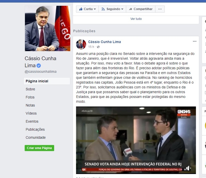 Cássio deu a declaração durante a votação no Senado Federal, na última terça-feira (20), sobre o decreto de intervenção federal no Rio. Sobre a Paraíba, ele comparou com o Rio de Janeiro.