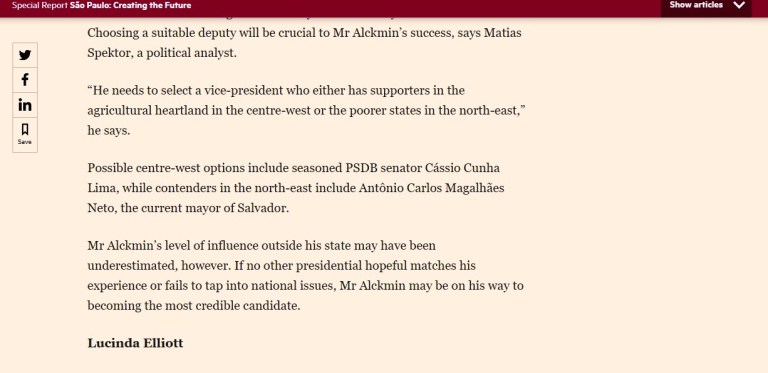 O jornal Financial Times citou o senador paraibano Cássio Cunha Lima (PSDB) entre as opções em análise para vice do governador de São Paulo, e também tucano, Geraldo Alckmin.