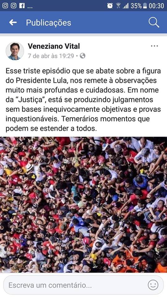 Vené resolveu prestar uma ‘homenagem’ ao ex-presidente Lula no seu Facebook, afirmando que Lula foi preso em um julgamento sem base e sem provas. Assim como Dilma Rousseff, vítima da ficção da ‘pedalada fiscal’, mas à época Veneziano votou pelo impeachment.