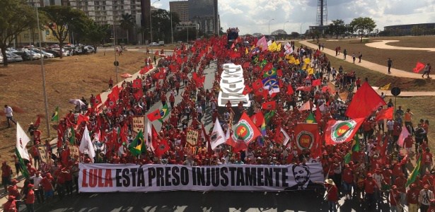 À frente marcha, os ativistas exibem uma faixa que diz que “Lula está preso injustamente”.