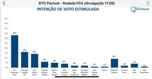 Uma nova pesquisa de intenção de votos foi divulgada na madrugada desta segunda-feira (17) pelo banco BTG Pactual em parceria com o Instituto FSB e traz Jair Bolsonaro (PSL) com 33% das intenções de voto, três pontos percentuais acima da semana passada. A pesquisa do BTG é a que tem dado maior pontuação a Bolsonaro na comparação aos outros levantamentos. Fernando Haddad (PT), passou de 8% para 16%. Ciro Gomes (PDT), chegou a 14%, ante 12% da semana anterior. Geraldo Alckmin (PSDB) tem 6%. Marina Silva (Rede) tem 5%.