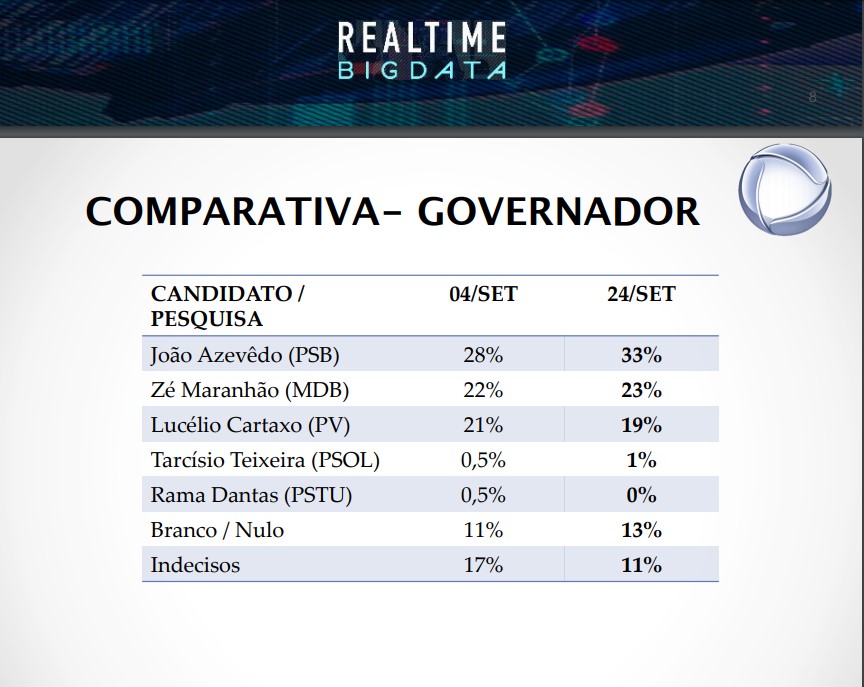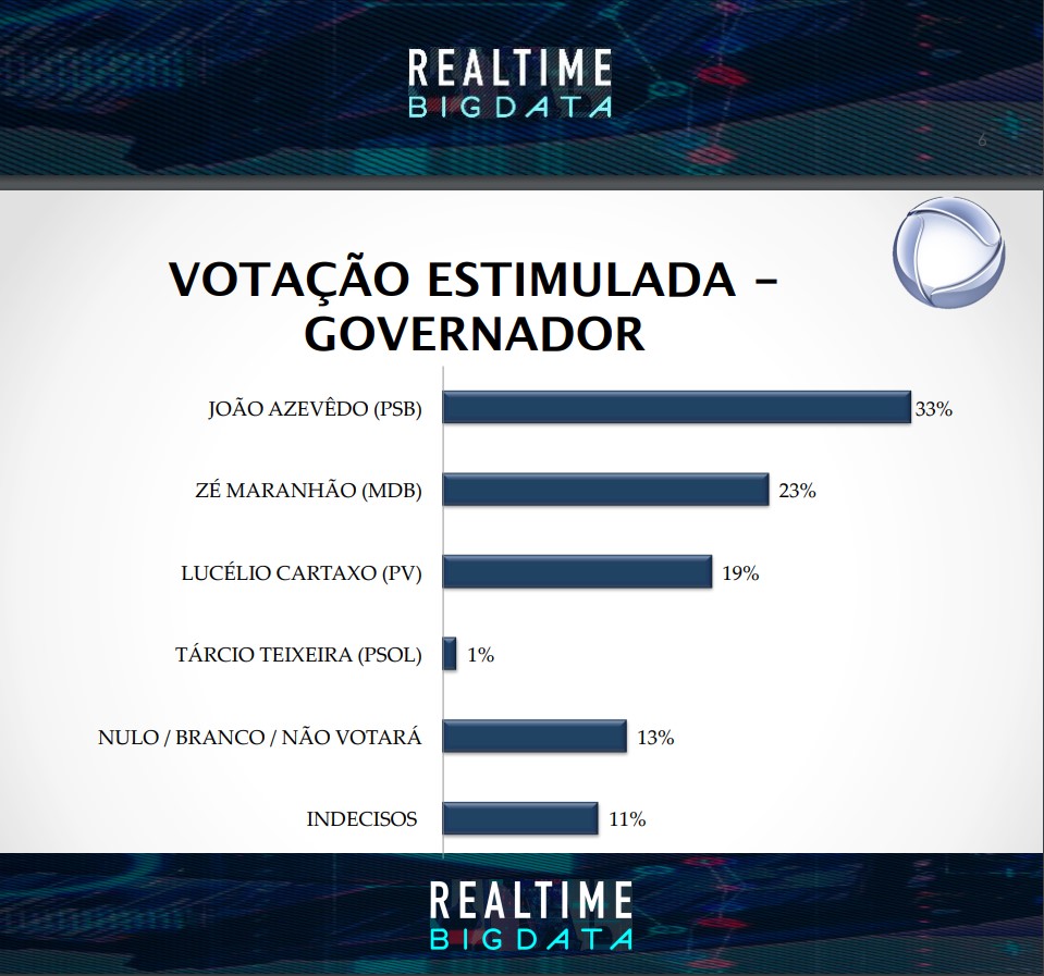 O candidato ao Governo do Estado da Paraíba, João Azevêdo (PSB) lidera mais uma pesquisa das intenções de voto com 33%, seguido de José Maranhão (MDB) com 23% e Lucélio Cartaxo com 19%. A pesquisa da Big Data/TV Record foi divulgada nessa segunda-feira (24).