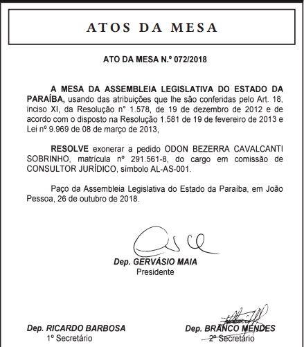 Segundo informações contidas no texto do ato assinado pelo presidente da ALPB, Gervásio Maia (PSB), a exoneração foi a pedido do próprio advogado. Para o lugar de Odon, foi nomeada Renata Karen Dantas Bezerra Cavalcanti.