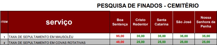 Os preços das taxas de sepultamento variam de acordo com o cemitério. De acordo com uma pesquisa divulgada pelo Procon-JP em outubro deste ano, as taxas de sepultamento em mausoléu variam de R$ 35 a R$ 95, sendo a mais cara no Cemitério da Boa Sentença. Já a taxa de sepultamento de cova rotativa vai de R$ 25 a R$ 48.