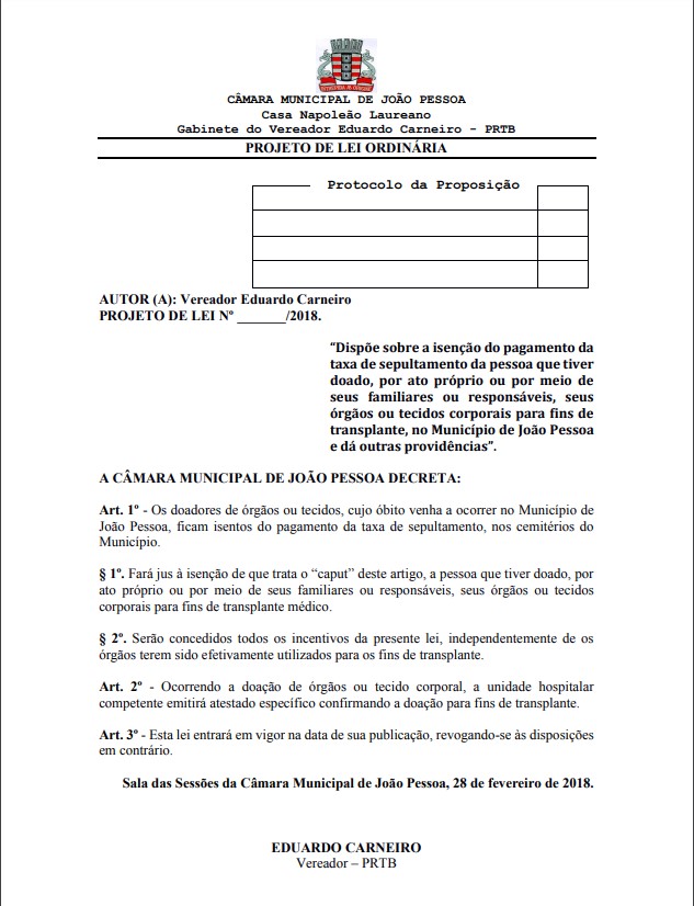 Um dos projetos aprovados na sessão na Câmara Municipal de João Pessoa (CMJP) nesta quarta-feira (28), foi o Projeto de Lei que concede a isenção da taxa de sepultamento da pessoa que tiver doado seus órgãos ou tecidos corporais para transplantes. Na descrição do projeto, a isenção só será realizada aos doadores cujo óbito aconteça no perímetro da Capital, a doação pode ter sido realizada por ato próprio ou por meio dos familiares ou responsáveis da pessoa falecida.