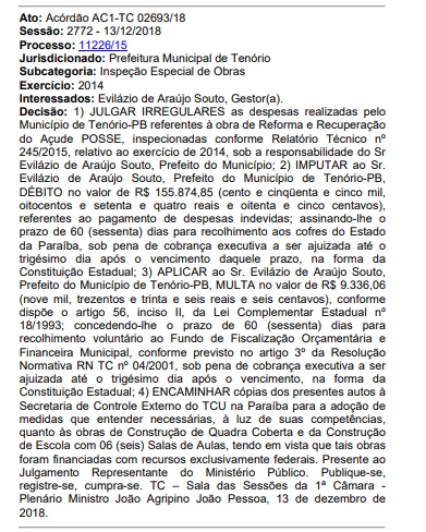 O Tribunal de Contas do Estado da Paraíba (TCE-PB) condenou o prefeito de Tenório, Evilázio de Araújo Souto, a devolver mais de R$ 165 mil aos cofres públicos. A condenação foi por irreguladades em obra de construção e recuperação do Açude Posse.