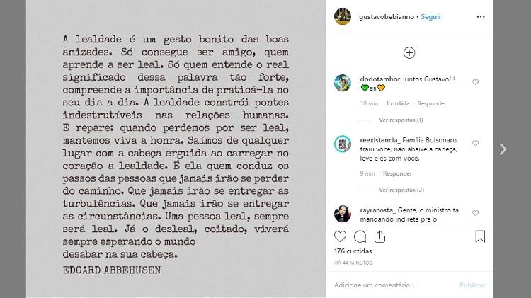 O texto é atribuído ao escritor brasileiro Edgard Abbehusen e foi publicado por Bebianno no Instagram, segundo aponta reportagem do portal Uol. “Saímos de qualquer lugar com a cabeça erguida ao carregar no coração a lealdade. É ela quem conduz os passos das pessoas que jamais irão se perder do caminho”, aponta ainda o texto. Bebianno chefiava interinamente o PSL quando da campanha eleitoral de 2018, sobre a qual recaem denúncias de uso de candidatos laranjas.