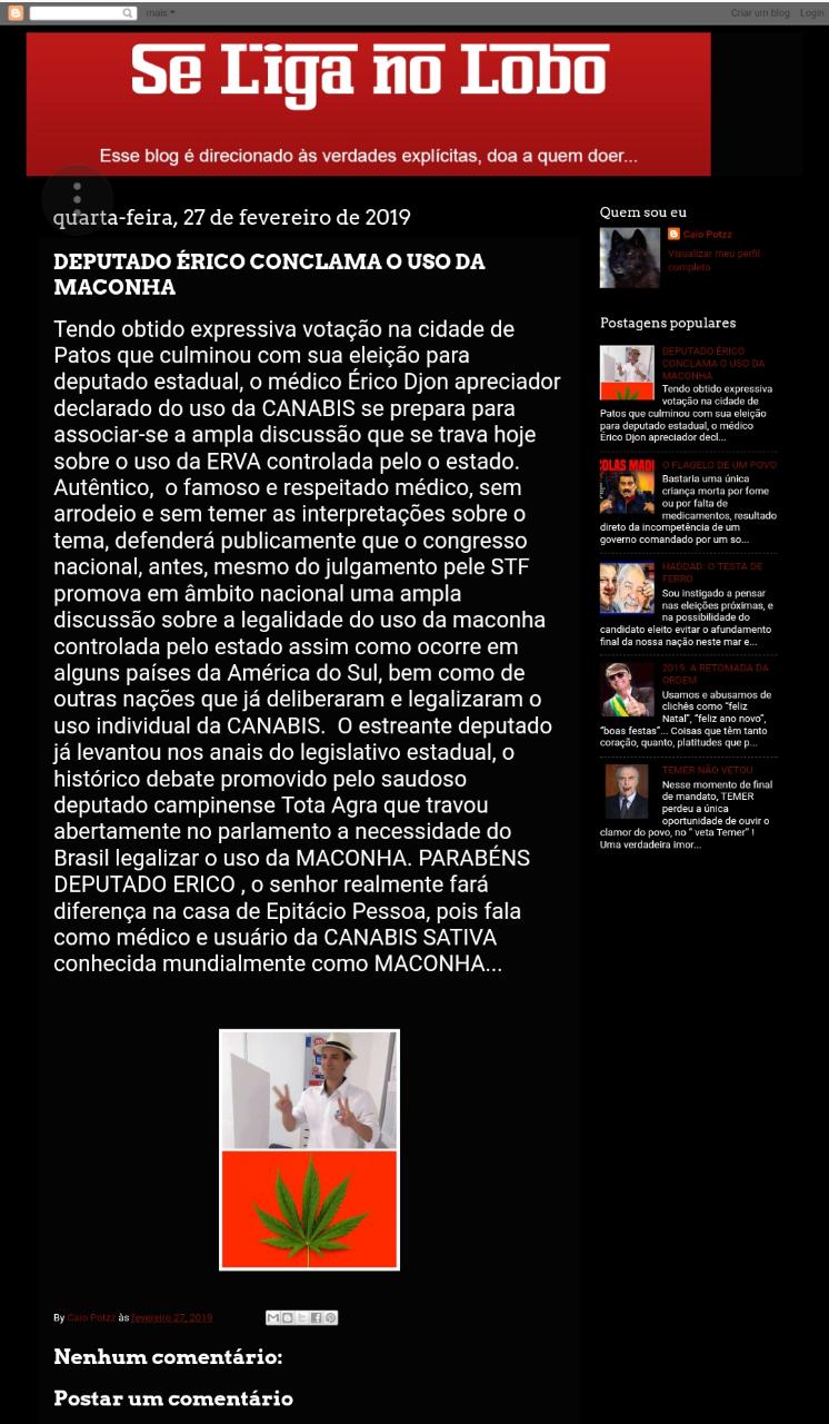 O deputado se referiu a uma postagem veiculada no dia de hoje em um blog anônimo, relatando que Dr. Érico “conclama a sociedade para o uso da maconha”. Segundo Dr. Érico, o caso ocorreu devido à sua ascensão política.