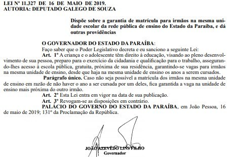 O governador João Azevêdo (PSB) sancionou uma lei que garante vaga para irmãos em uma mesma escola da rede pública de ensino estadual da Paraíba. A medida foi publicada na edição desta sexta-feira (17) do Diário Oficial do Estado (DOE). A Lei nº 11.327 de 16 de maio de 2019 é de autoria do deputado estadual Galego de Souza.