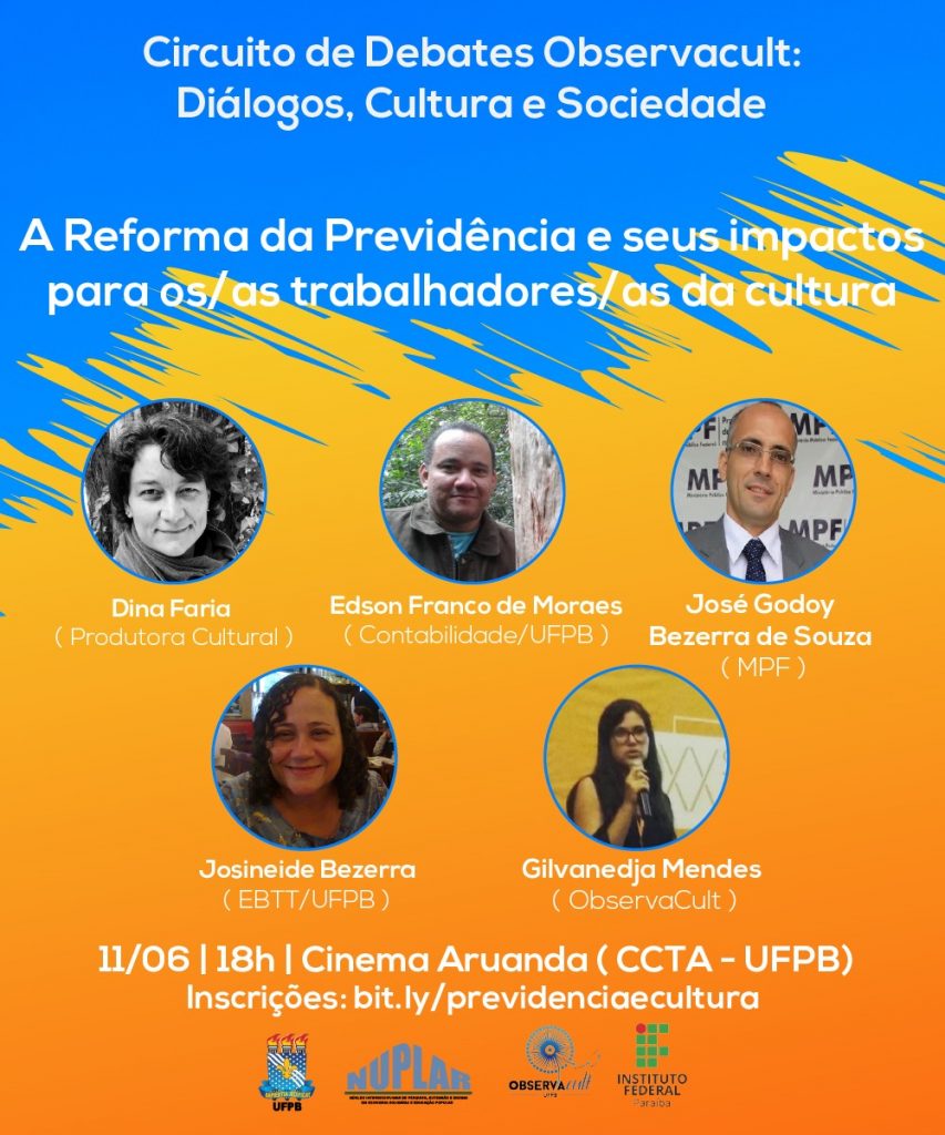 O Observatório de Políticas Culturais (ObservaCult), grupo de pesquisa e extensão ligado à Universidade Federal da Paraíba, realizará o debate “A Reforma da Previdência e seus impactos para os trabalhadores da cultura”. A mesa-redonda ocorrerá na próxima terça-feira (11/06), às 18h, na Sala de Cinema Aruanda, localizada no Centro de Comunicação Turismo e Artes – CCTA. A entrada é gratuita e aberta ao público. Mas quem tiver interesse em receber certificado, deverá inscrever-se através do link: http://bit.ly/previdenciaecultura.