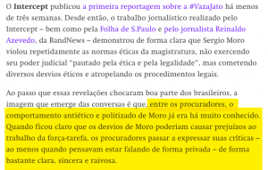 Antes, Glenn havia escrito que “Ninguém mais precisa argumentar se a conduta de Moro como um juiz era antiética, corrupto e imprópria. Os próprios promotores sabiam e – pelo menos em segredo – reconheceram isso e reclamaram com grande raiva, mas também grande clareza sobre isso”.