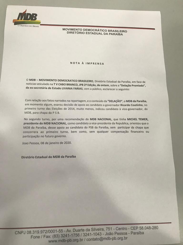 O Diretório Estadual do MDB se manifestou negou, por meio de nota, nesta quarta-feira (7), a informação veiculada em trecho da delação premiada da ex-secretária de Estado da Administração, Livânia Farias, no âmbito da Operação Calvário. De acordo com o partido, “em momento algum, exarou decisão de apoio ao candidato a governador Ricardo Coutinho, no primeiro turno das eleições de 2014, muito menos, indicou candidato à vice-governador, do MDB, para chapa do PSB”.