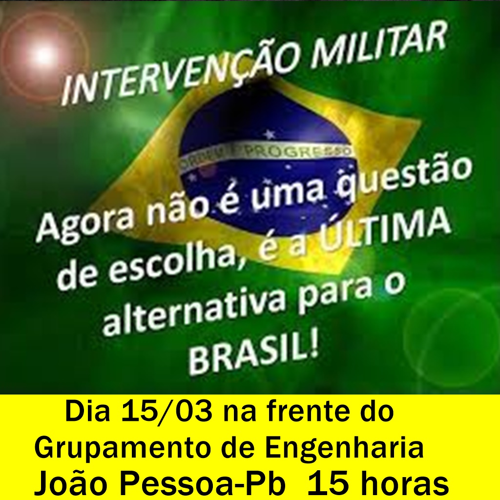 A redação do Portal WSCOM teve acesso, neste domingo (1), a algumas imagens que estão sendo compartilhadas em grupos de conversas pelo WhatsApp, convocando apoiadores da intervenção militar no Brasil para mobilização, no próximo dia 15, às 15h, em frente ao Grupamento de Engenharia, em João Pessoa.