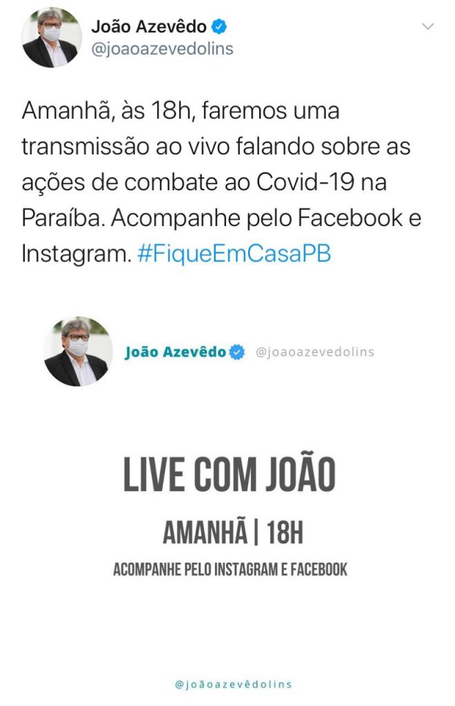 Às 18h, João Azevêdo fará transmissão ao vivo falando sobre ações de combate à Covid-19 na Paraíba, por meio das redes sociais Instagram e Facebook.