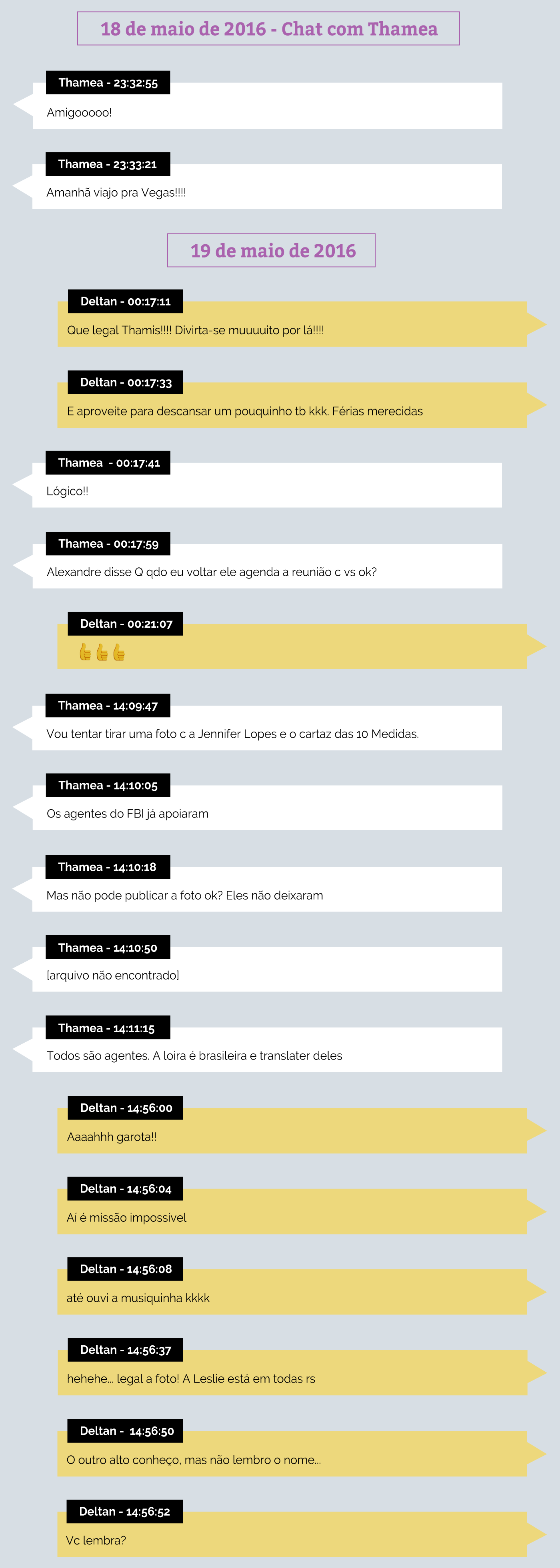 Em um chat com Deltan em 18 de maio de 2016 constante do arquivo entregue ao site The Intercept Brasil, a procuradora Thaméa Danelon, ex-coordenadora da Força-Tarefa em São Paulo, brincou antes uma viagem para os EUA: “Vou tentar tirar uma foto c a Jennifer Lopes e o cartaz das 10 Medidas”, brinca ela. “Os agentes do FBI já apoiaram. Mas não pode publicar a foto ok? Eles não deixaram”, explica Thaméa, enviando a foto a seguir.