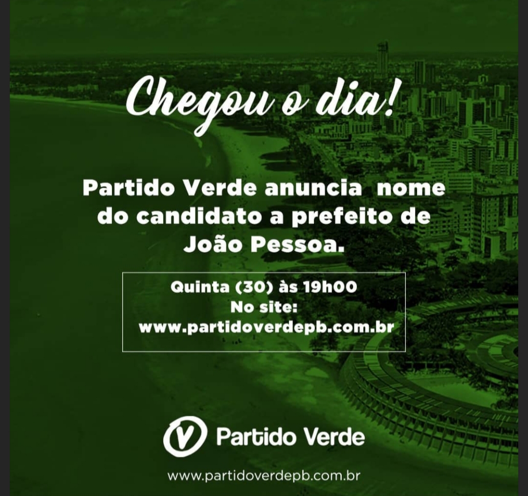 O Partido Verde (PV) anuncia, através de uma live nesta quinta-feira (29), o nome de seu pré-candidato à sucessão municipal em João Pessoa. O anúncio será feito pelo pelo prefeito da Capital, Luciano Cartaxo, e acontecerá a partir das 19h através do site (www.partidoverdepb.com.br).