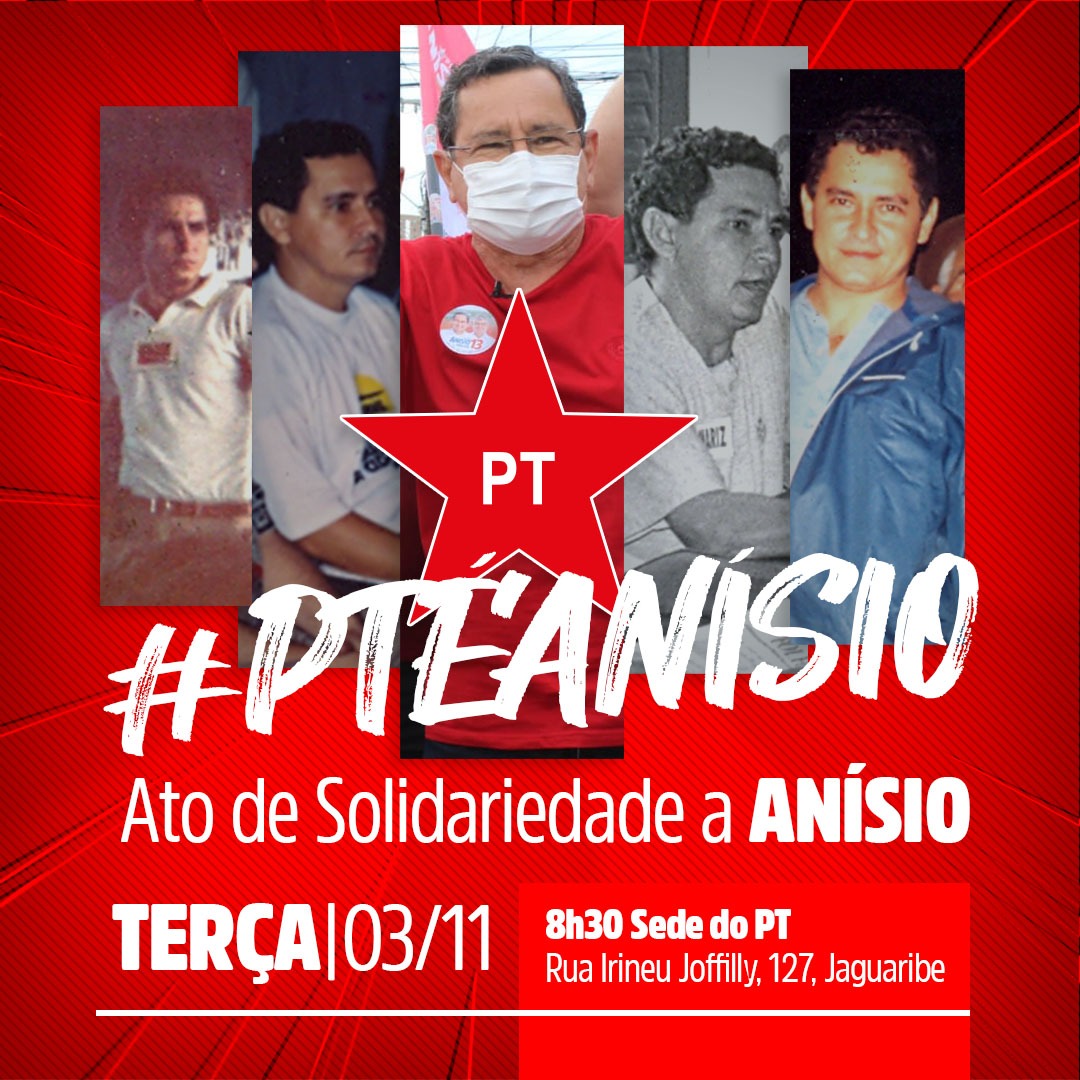Ex-dirigentes e filiados do Partido dos Trabalhadores (PT), em João Pessoa, realizam, nesta terça-feira (3), à partir das 8h30, um ato em apoio ao candidato a prefeito da Capital, Anísio Maia (PT), que teve um pedido de expulsão formalizado pela Comissão interventora nomeada pela Executiva Nacional após manutenção de sua candidatura nas eleições municipais deste ano.