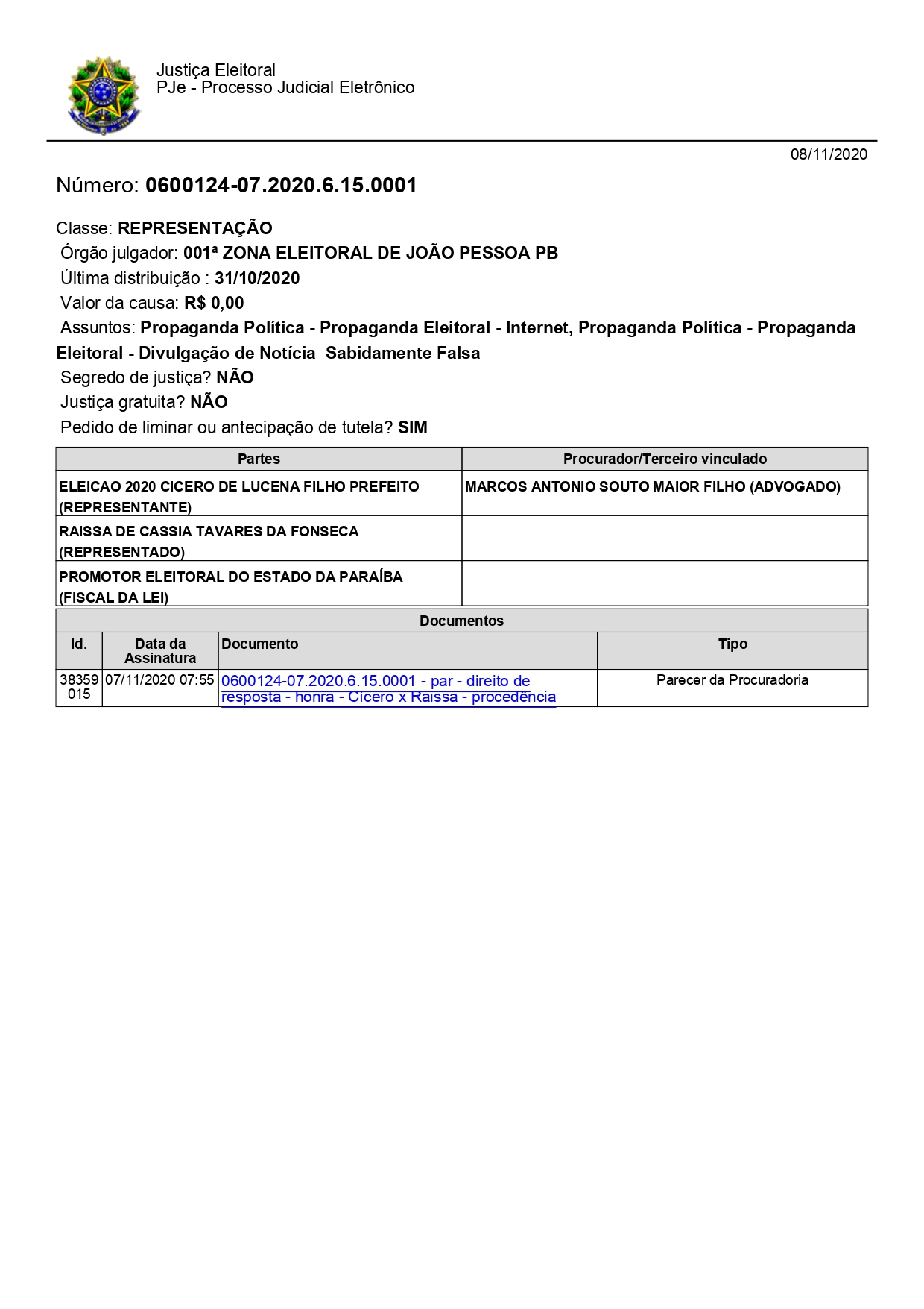 O Ministério Público Eleitoral (MPE) apontou que Raíssa Cássia Fonseca cometeu crime eleitoral, após vídeo divulgado em suas redes sociais, contra o candidato a prefeito de João Pessoa, Cícero Lucena (Progressistas). Ela é filha da candidata a vice-prefeita de João Pessoa na Chapa com Wallber Virgolino, professora Leila Fonseca (Patriota). Raíssa já responde uma outra ação na Justiça Eleitoral movida pela defesa do progressista objetivando coibir comportamentos contrários ao ordenamento jurídico.