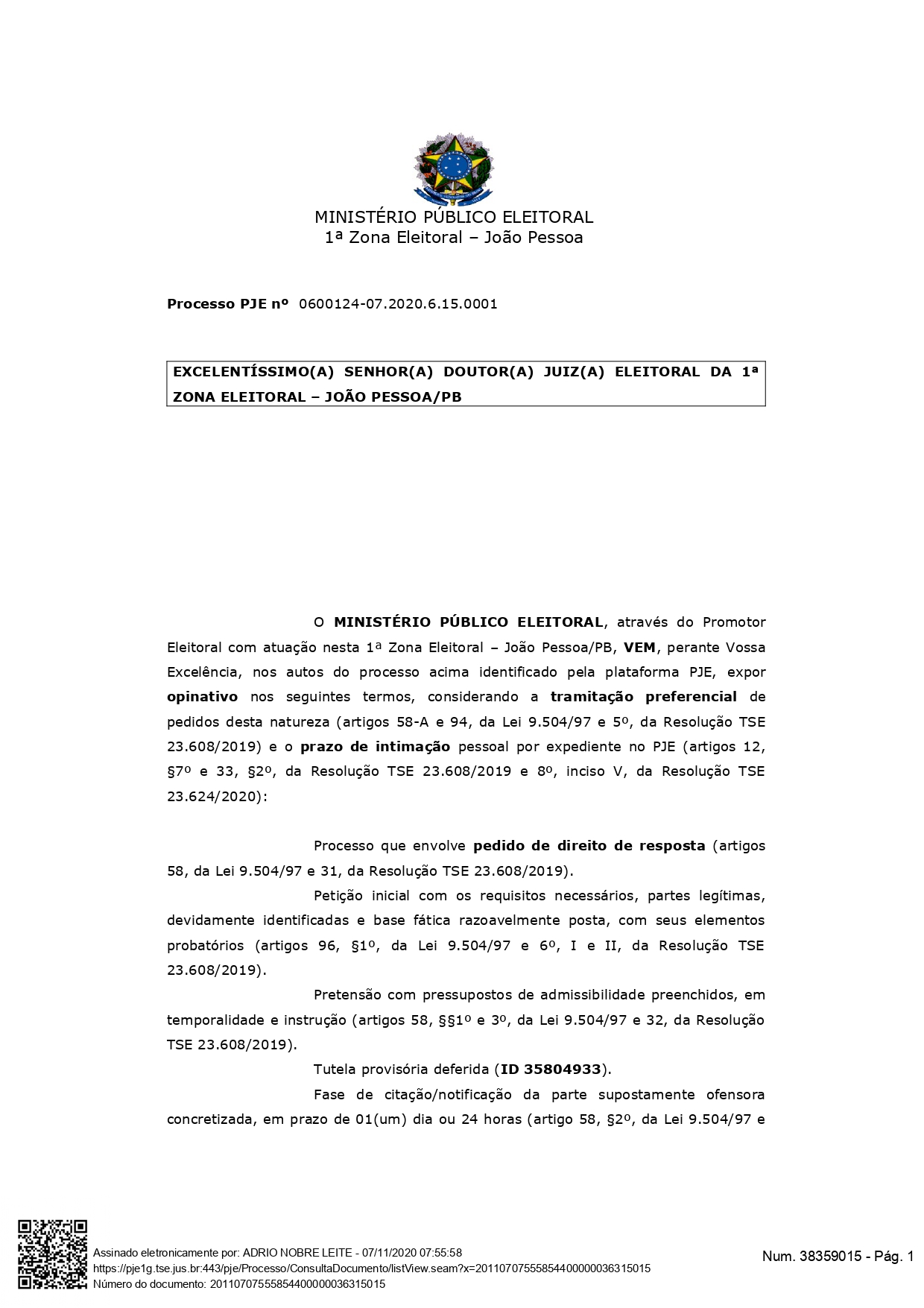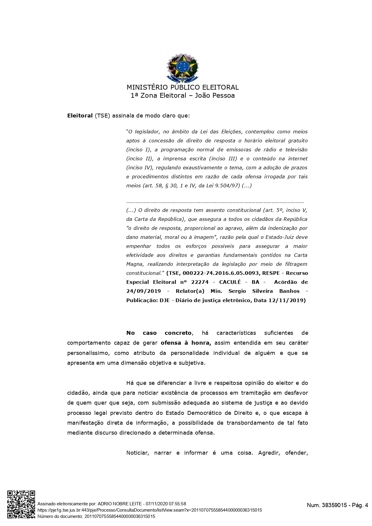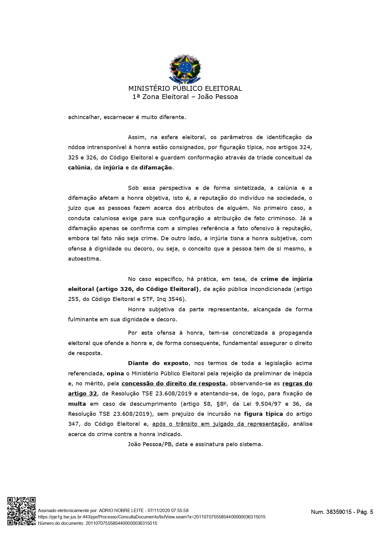 “No caso específico, há prática, em tese, de crime de injúria eleitoral (artigo 326, do Código Eleitoral), de ação pública incondicionada (artigo 255, do Código Eleitoral e STF, Inq 3546). Honra subjetiva da parte representante, alcançada de forma fulminante em sua dignidade e decoro. Por esta ofensa à honra, tem-se concretizada a propaganda eleitoral que ofende a honra e, de forma consequente, fundamental assegurar o direito de resposta“, diz outro trecho documento.
