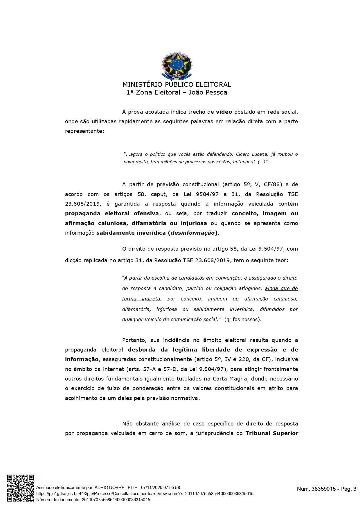 O MPE, através de exposição opinativa, considerou legítimo o pedido de direito de resposta solicitado por Cícero. Um dos trechos apontados no processo diz que no “vídeo postado em rede social, são utilizadas rapidamente as seguintes palavras em relação direta com a parte representante: “… agora o político que vocês estão defendendo, Cícero Lucena, já roubou o povo muito, tem milhões de processos nas costas, entendeu! (…)”