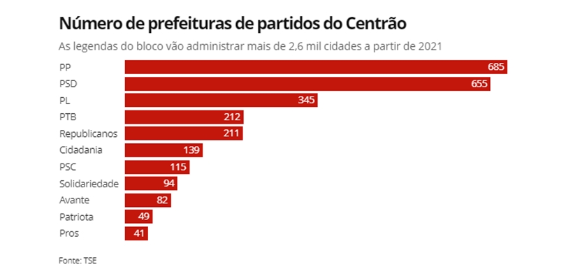 O grupo de partidos que formam o chamado Centrão, base política na Câmara dos Deputados, vai administrar mais de 2,6 mil municípios a partir de 2021, o equivalente a 47% das cidades brasileiras. O número de moradores nesses municípios (cerca de 78 milhões de pessoas), por sua vez, representa aproximadamente 40% da população do país.