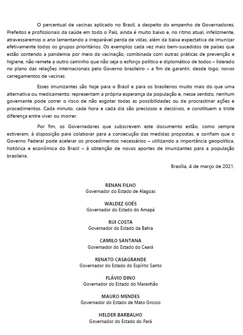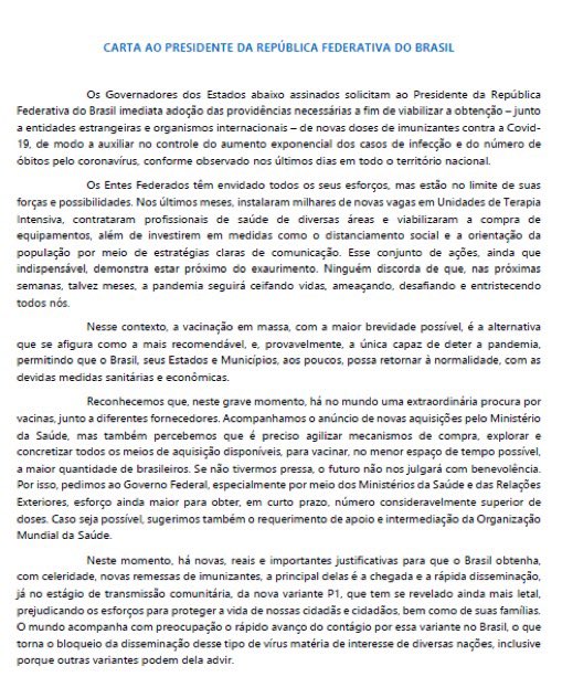 Na carta, os líderes ressaltam que “os Entes federados têm envidado todos os seus esforços, mas estão no limite de suas forças e possibilidades. Nos últimos meses, instalaram milhares de novas vagas em Unidades de Terapia Intensiva, contrataram profissionais de saúde de diversas áreas e viabilizaram a compra de equipamentos”.