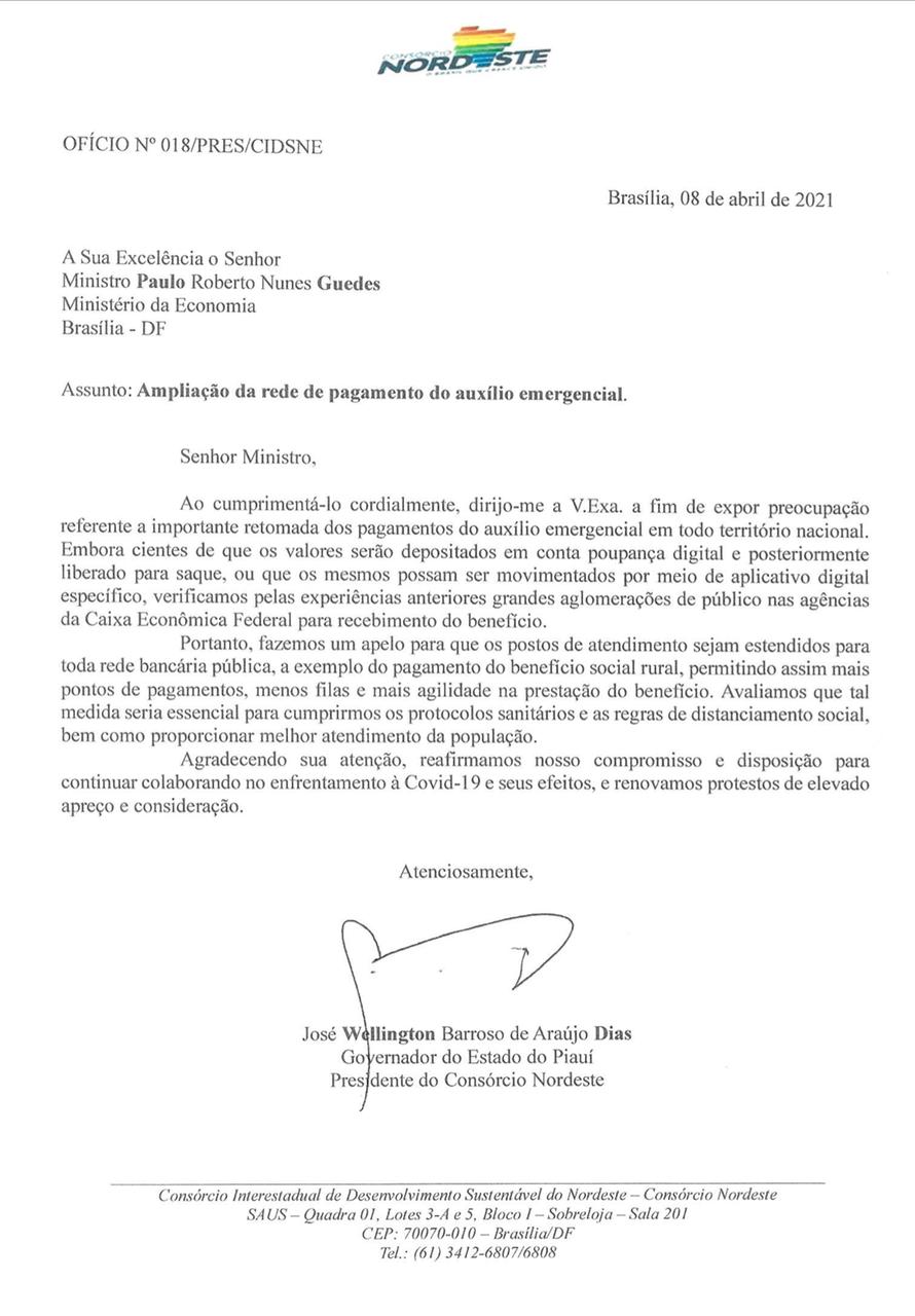 O governador do Piauí apela no documento para que o pagamento do auxílio emergencial seja estendido a toda a rede bancária pública, criando assim mais pontos de atendimento com o intuito de evitar filas e promover agilidade no recebimento do benefício.