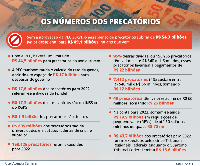 Com o limite, em 2022 o governo poderá pagar cerca de R$ 44,5 bilhões em vez dos R$ 89,1 bilhões previstos. Outros R$ 47 bilhões de folga orçamentária serão abertos com a mudança no cálculo da correção do teto de gastos.