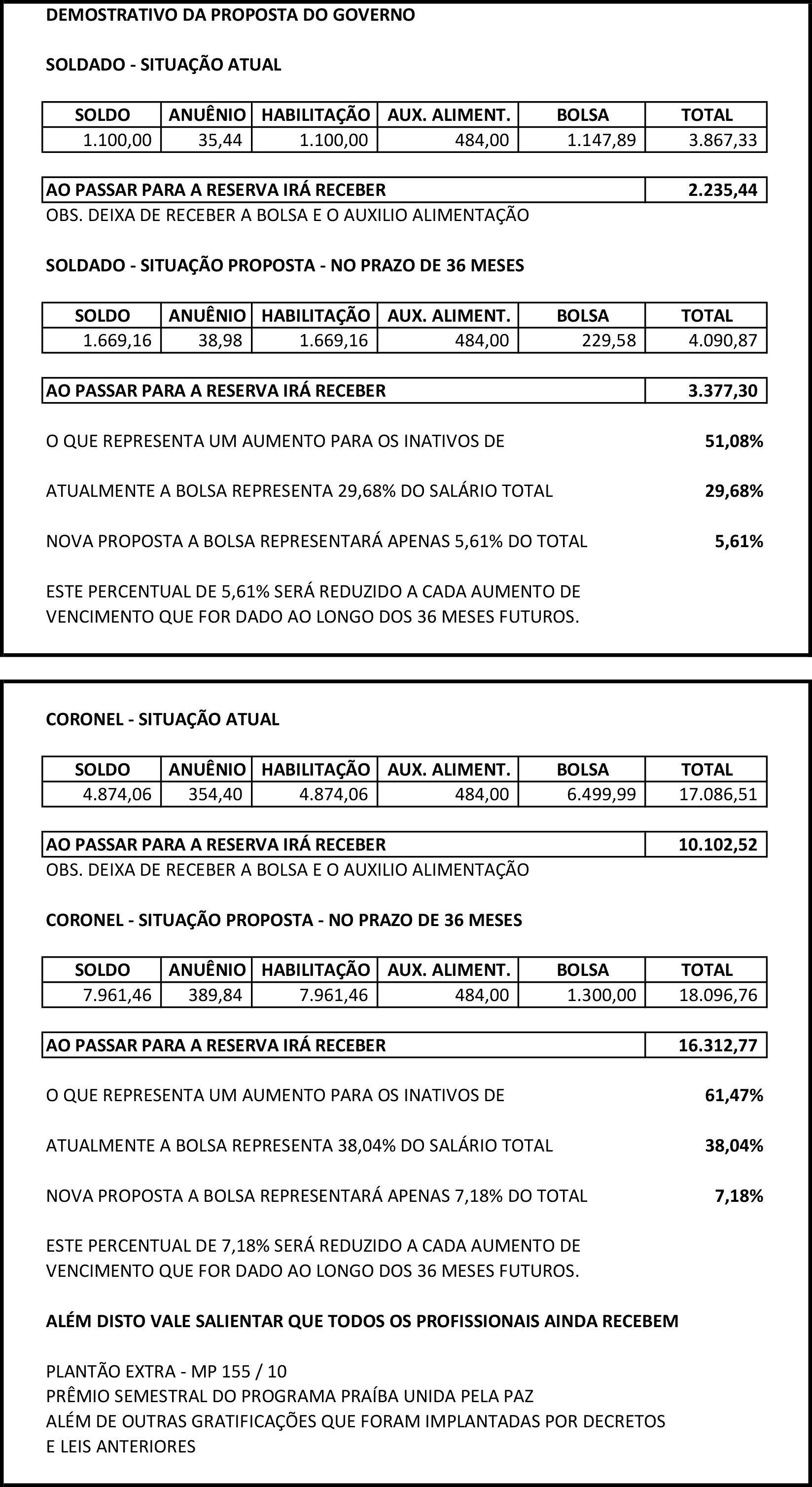 A bolsa desempenho, que hoje representa 29,68% do salário total de um soldado e 38,04% do salário de um coronel, será reduzida a 5,61% para o soldado e 7,18% para o coronel, percentuais que serão reduzidos a cada reajuste salarial que for concedido ao longo dos próximos 36 meses, garantindo a tranquilidade dos integrantes das forças de Segurança no momento da aposentadoria.