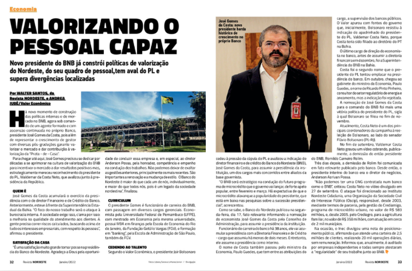 Segundo o Valor Econômico, o presidente Jair Bolsonaro cedeu à pressão da cúpula do PL e avalizou a indicação do diretor financeiro e de crédito do Banco do Nordeste (BNB), José Gomes da Costa, para assumir a presidência da instituição, um dos cargos mais concorridos entre aliados da base governista.