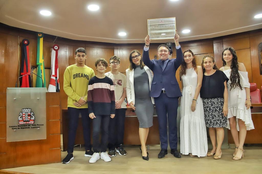 Em uma manhã repleta de emoções, o jornalista Heron Cid recebeu, nesta sexta-feira (3), o título de Cidadão pessoense da Câmara Municipal de João Pessoa. A entrega da honraria, que foi uma propositura do vereador Bosquinho (PV), aconteceu no plenário Senador Humberto Lucena e contou com a presença de profissionais da comunicação, empresários, magistrados, advogados, vereadores, parlamentares estaduais e federais, além da família do homenageado.
