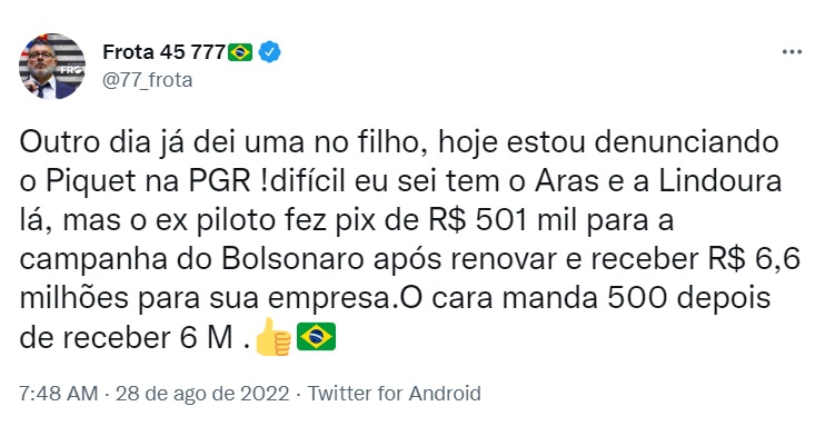 “Outro dia já dei uma no filho, hoje estou denunciando o Piquet na PGR! difícil eu sei tem o Aras e a Lindoura lá, mas o ex piloto fez pix de R$ 501 mil para a campanha do Bolsonaro após renovar e receber R$ 6,6 milhões para sua empresa.O cara manda 500 depois de receber 6 M”, disse Frota.