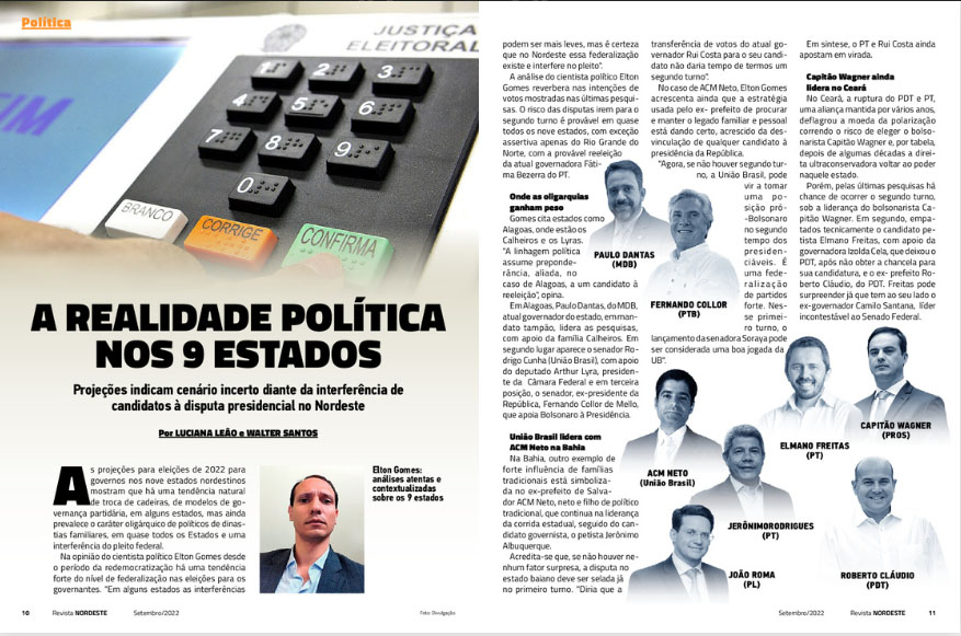 A edição 188 da Revista NORDESTE apresenta a realidade política dos nove estados nordestinos. A reportagem assinada pelos jornalistas Walter Santos e Luciana Leão aponta as projeções para as eleições de 2022, com tendência natural de troca de cadeiras, modelos de governança partidária, em alguns estados, mas ainda prevalecendo o caráter oligárquico de políticos de dinastias familiares.