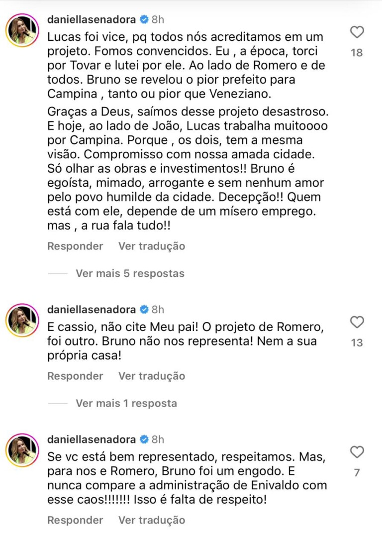 “Lucas foi vice porque todos nós acreditamos em um projeto. Fomos convencidos. Eu, a época, torci por Tovar e lutei por ele. Ao lado de Romero e de todos. Bruno se revelou o pior prefeito para Campina, tanto ou pior que Veneziano. Graças a Deus saímos desse projeto desastroso. E hoje, ao lado de João, Lucas trabalha muito por Campina. Porque os dois têm a mesma visão. Compromisso com nossa amada cidade. Só olhar as obras e investimentos!! Bruno é egoísta, mimado, arrogante e sem nenhum amor pelo povo humilde da cidade. Decepção!! Quem está com ele, depende de um mísero emprego. Mas a rua fala tudo!!”, escreveu Daniella.