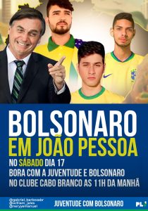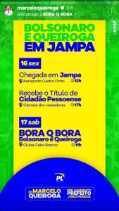 No sábado, Bolsonaro participa do evento ‘Bora Q Bora’ para lançamento da pré-candidatura do médico Marcelo Queiroga a prefeito de João Pessoa com o apoio do ex-presidente. O encontro político, que será realizado as 11h no Clube Cabo Branco, no bairro Miramar, deve reunir bolsonaristas, a militância do PL, apoiadores e eleitores da direita, além de simpatizantes das ideias conservadoras do grupo.